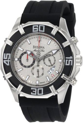 A flurry of function for the adventurer at heart, the Bulova Men's Solano Marine Star Rubber Strap Watch has a lot to offer. This intrepid timepiece begins with a 46mm stainless steel case with a fixed stainless steel bezel with a black-toned top with Arabic markers and a textured crown. These elements surround a silver dial, which is protected by a mineral crystal and features luminous index hour markers and luminous hands powered by Japanese quartz movement. The dial also features three chronograph sub-dials offering 60-minute, 60-second and 24-hour displays and a date display window at the 4 'o clock position. A black polyurethane bracelet straps this watch to the wrist, while a buckle clasp ensures its secure placement. Finally, this watch boasts water resistance up to 330 feet (100 meters). If you need your watch to be more than just stylish, then this is the watch for you.