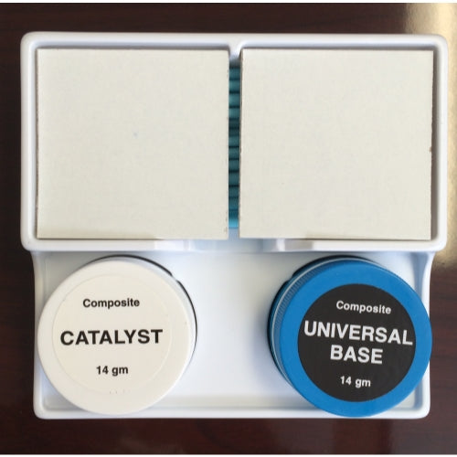 14g catalyst paste jar, 14g base paste jar, spatulas and instructions.