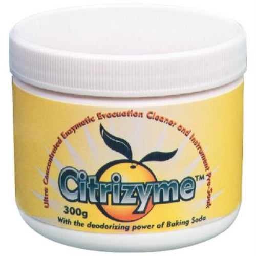 Description: Citrizyme Enzyme Powder - Tub (300gm) A fast-acting dual enzyme formula that quickly removes proteins & carbohydrates associated with inanimate organic material or deposits. Leaves no residue with a premium non-foaming formula that dissolves instantly in warm tap water with no mixing required. Fresh citrus scent & color. Not a disinfectant or a pesticide. Ultra Concentrated Enzyme Powder. 300gm tub - makes 35 gallons. Good for 140 treatments.