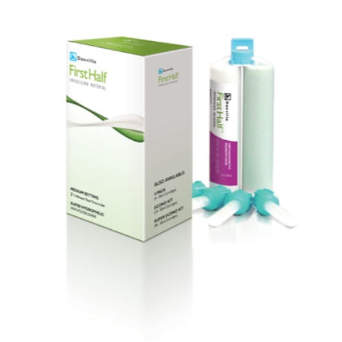 Description: First Half Medium Set, Monophase Ortho, Violet, VPS impression material. Setting time - 2 min. 15 sec./working time - 1 min. 15 sec. 4 Pack: 4 - 50 ml split cartridges and 12 tips.