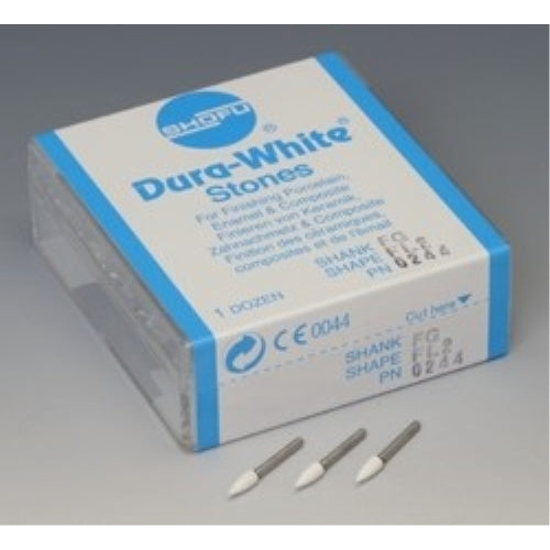 Description: FL2 flame FG (friction grip) Shofu Dental Dura-White aluminum oxide finishing stones, box of 12 stones.