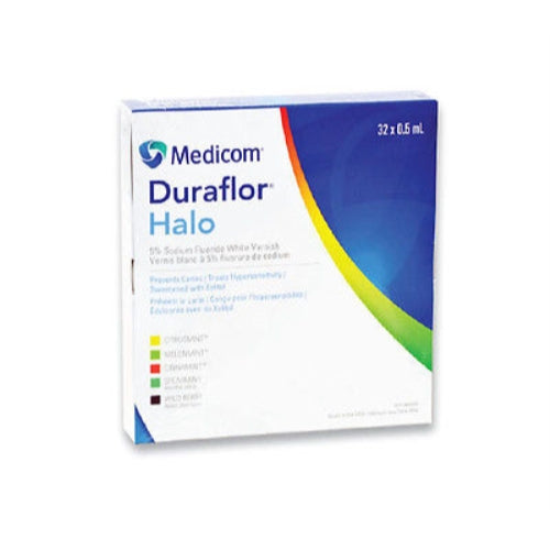 Description: Duraflor Halo Varnish - Wild Berry, 32 Units. 5% Sodium Fluoride White Varnish. Treats Hypersensitivity. Sweetened with Xylitol. Box of 32 - 0.5 mL Unit Doses.