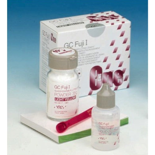 Fuji I - Glass Ionomer Luting Cement, Light Yellow, 1:1 Package: 35 Gm. Powder, 25 Gm. Liquid, Spatula and Mixing Pad.